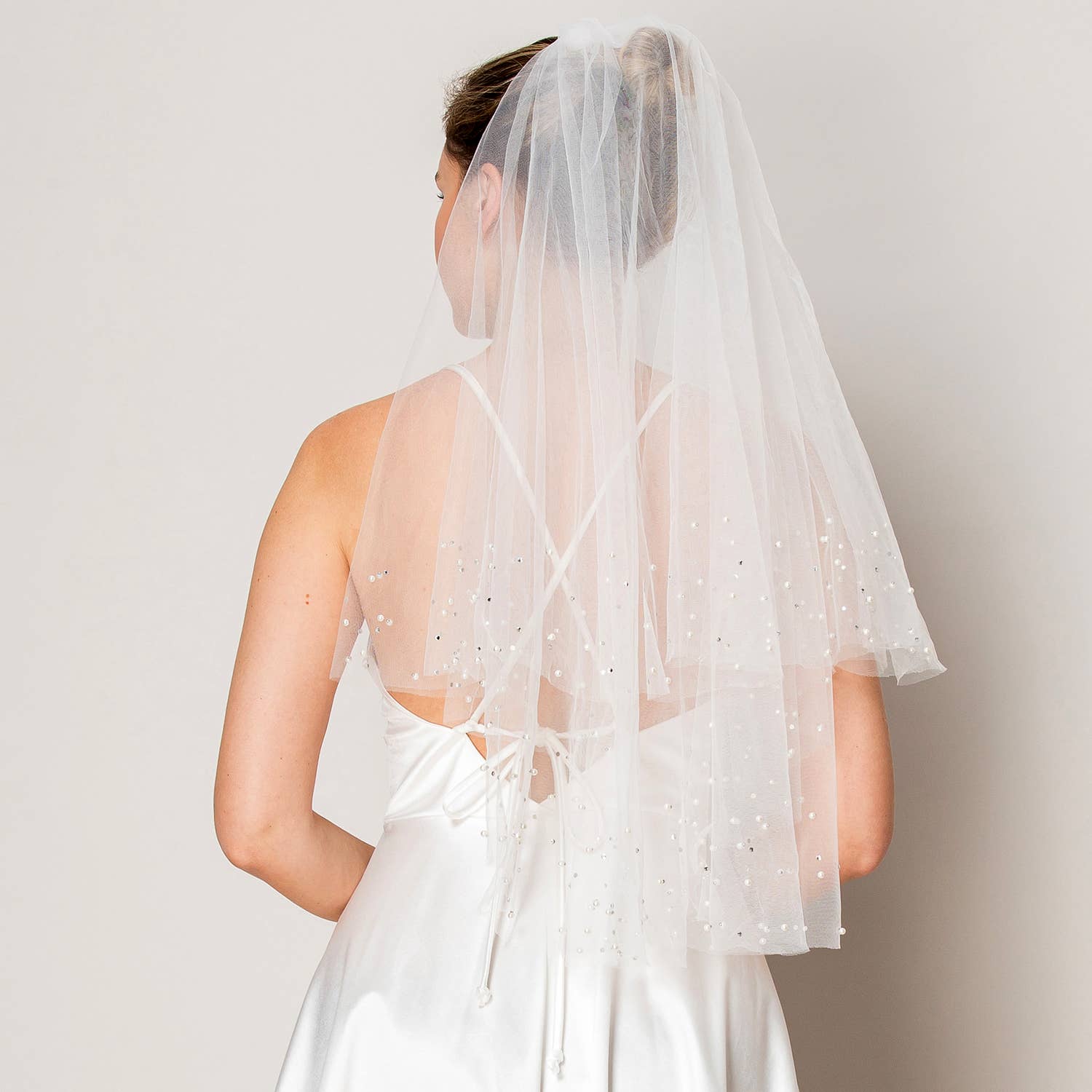 Key Features: This waist-length bridal veil features a soft two-layer silhouette adorned with scattered rhinestones and pearls, creating a harmonious blend of shimmer and elegance. The lightweight tulle drapes beautifully, adding graceful movement and a luminous finish. With its timeless charm and sophisticated detailing, this veil is a stunning complement to a wide range of bridal styles.